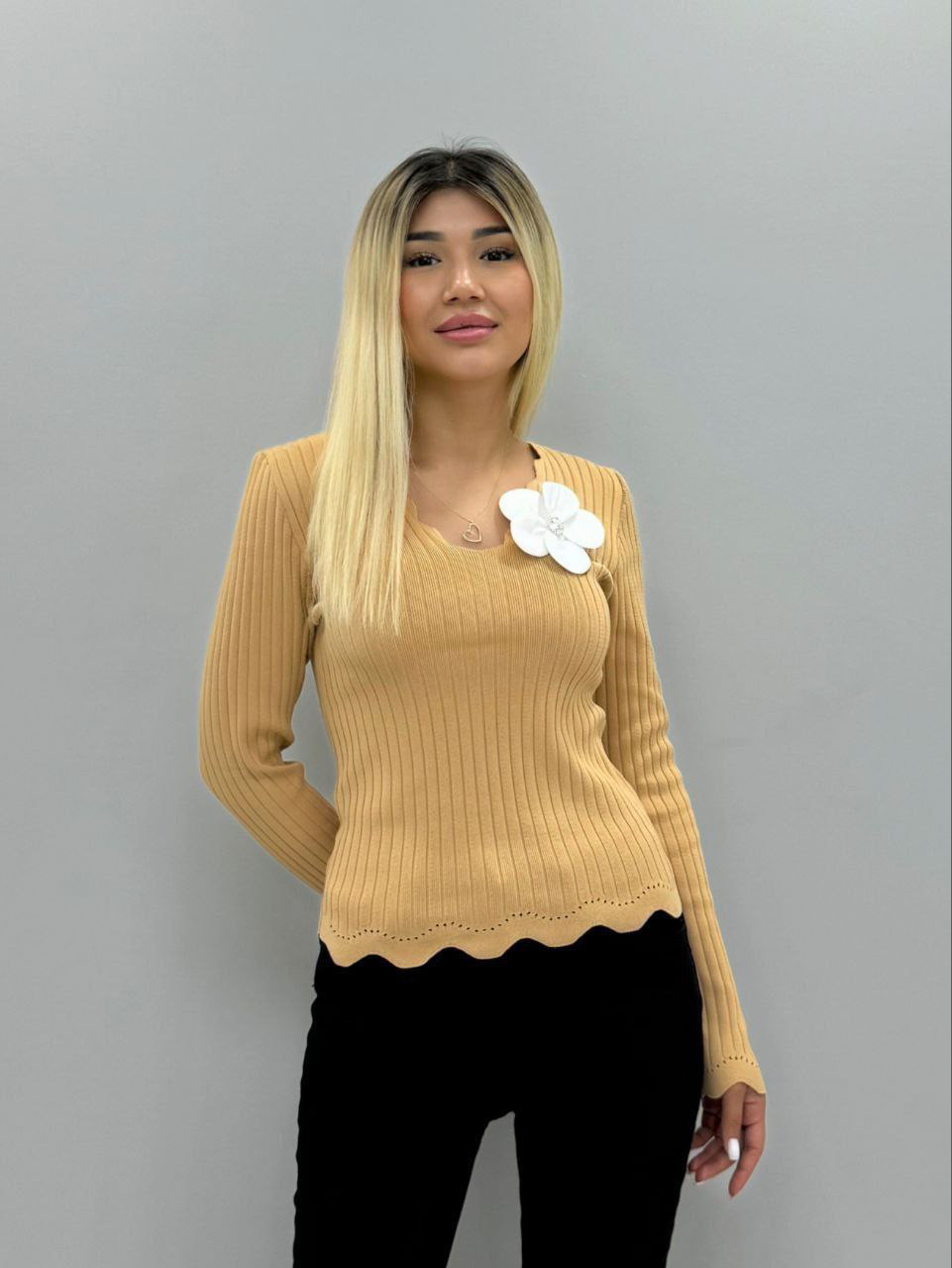 Bluză simplă cu detaliu floare albă, perfectă pentru ținute casual sau elegante. Confortabilă, ușor de asortat.