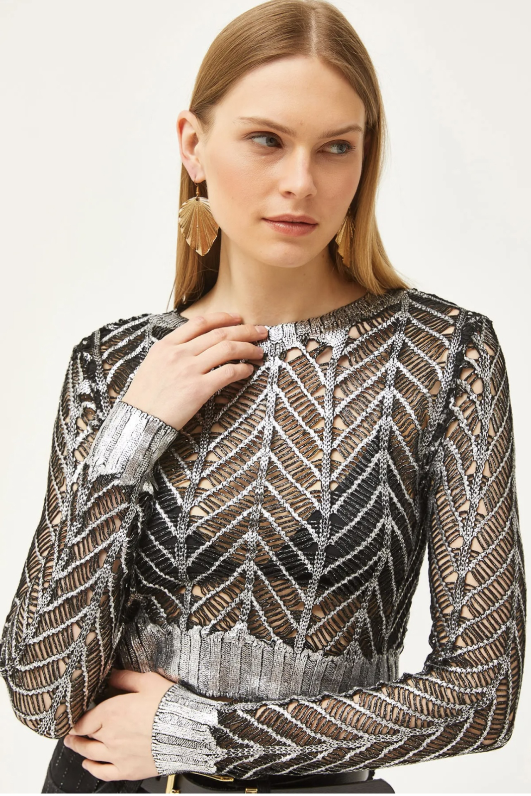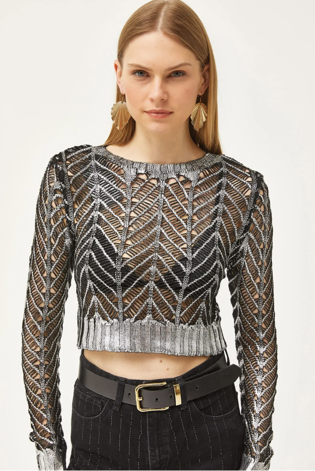 Descoperă bluză metalică ajurată neagră, perfectă pentru ocazii speciale sau ținute de seară. Material fin, design modern și detalii elegante care îți evidențiază stilul unic.