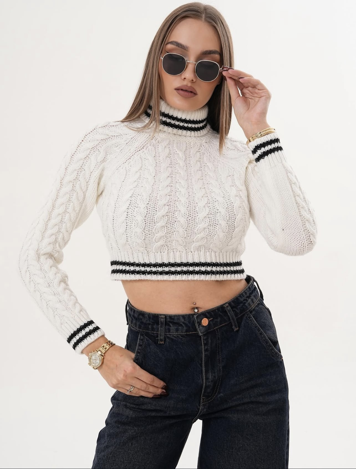 Pulover scurt alb, perfect pentru ținute casual sau elegante. Design modern, material confortabil și croială chic care îți evidențiază stilul în orice ocazie.