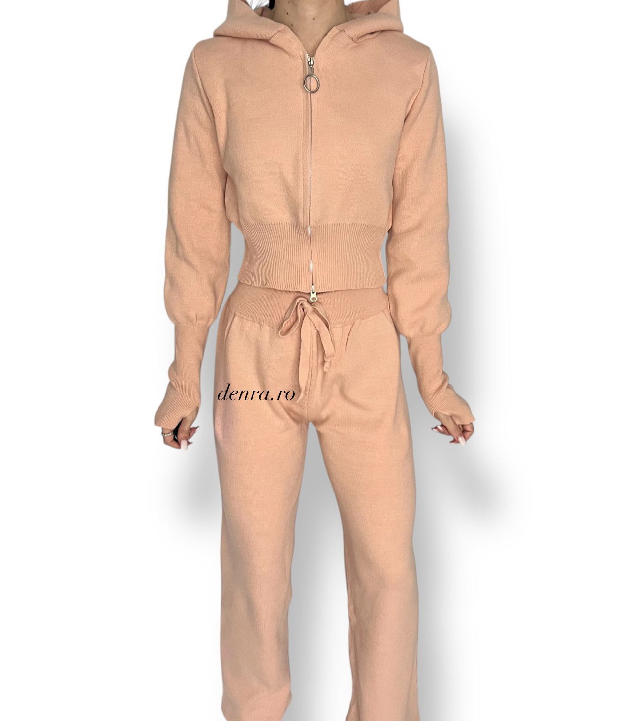 Compleu tricot 2 piese cu bluză cu fermoar și glugă și pantaloni evazați. Confort, stil și versatilitate pentru ținute casual-chic de zi cu zi.