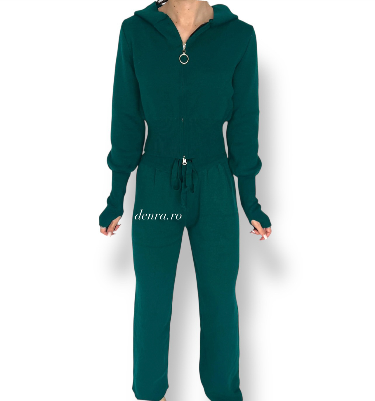 Compleu tricot 2 piese cu bluză cu fermoar și glugă și pantaloni evazați. Confort, stil și versatilitate pentru ținute casual-chic de zi cu zi.