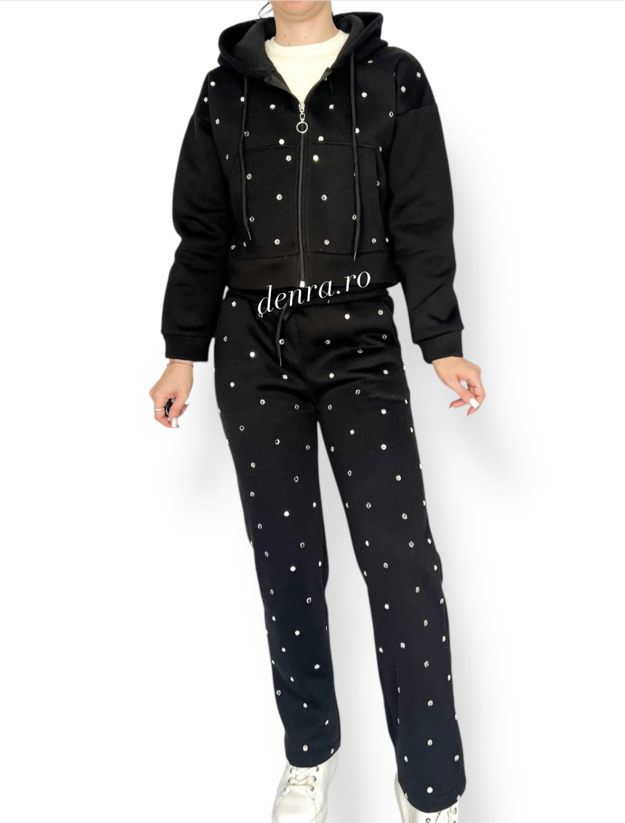 Strălucește în confort și stil cu acest compleu din 2 piese negru, vătuit, cu pietricele. Realizat dintr-un material moale și călduros, este alegerea ideală pentru zilele mai reci, oferind o combinație perfectă între eleganță și lejeritate.