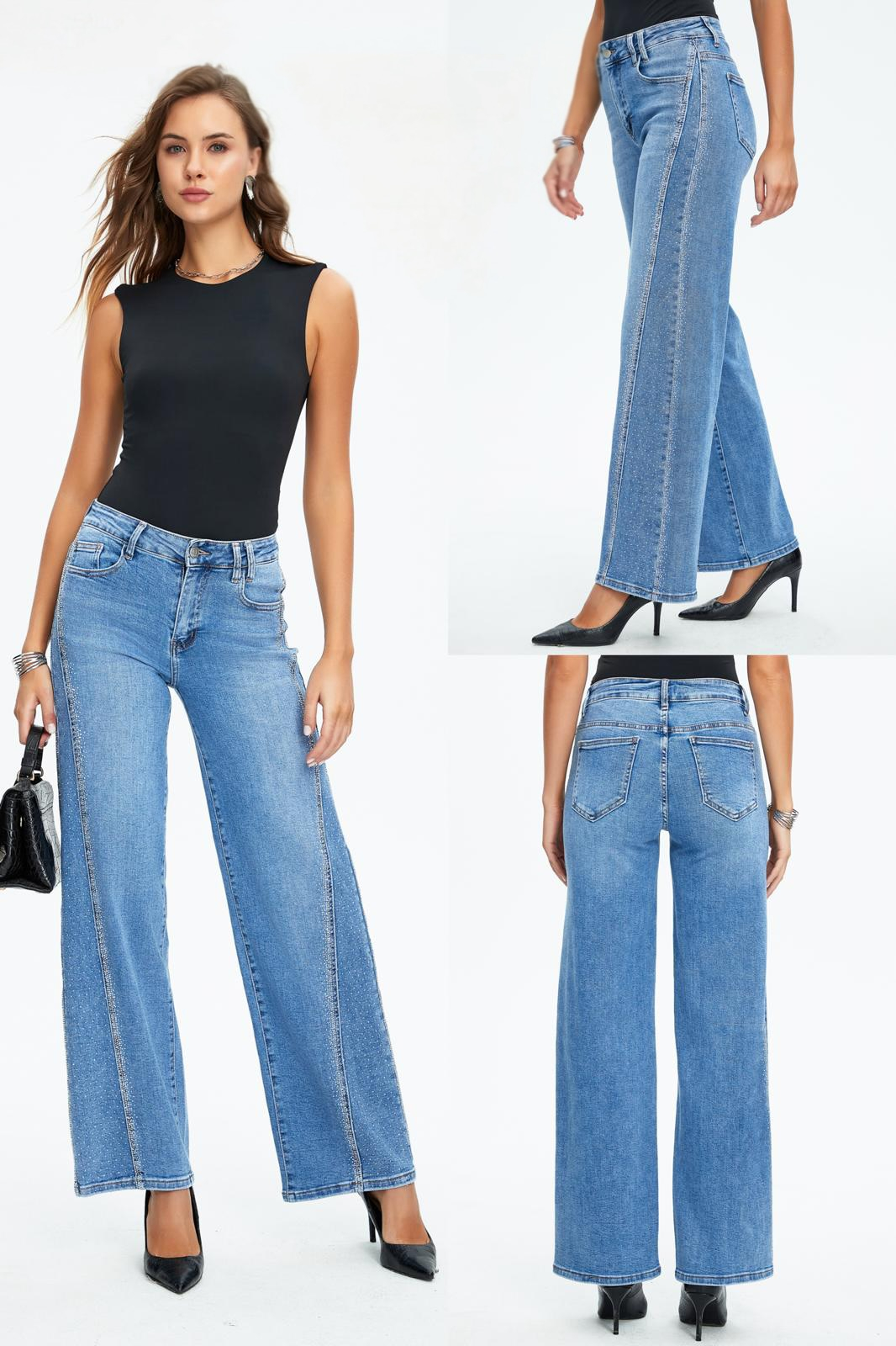 Evidențiază-ți ținutele cu blugii wide leg cu sclipici pe lateral. Croiala lejeră și detaliile strălucitoare adaugă un plus de glam, oferind un look modern, feminin și ușor de asortat. Perfecți pentru outfituri casual-chic sau de seară.