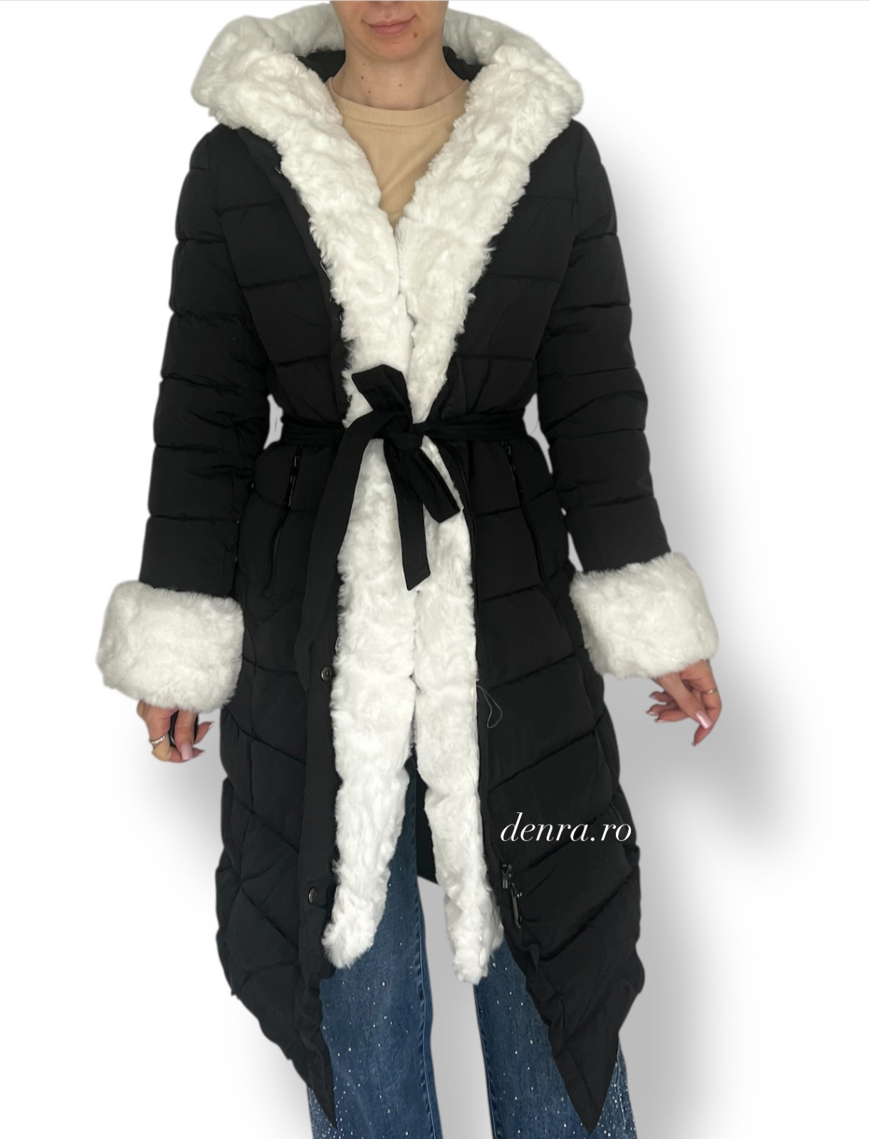 Geacă lungă de iarnă neagră cu blană bogată, ideală pentru un look sofisticat și protecție maximă împotriva frigului. Design modern, croială feminină și confort termic superior, perfectă pentru sezonul rece.