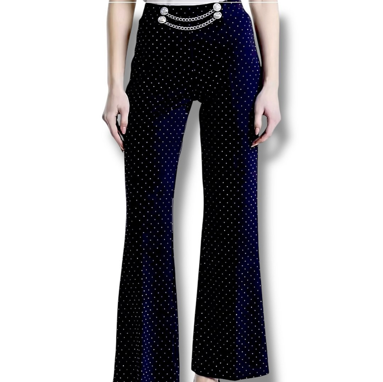Ieși din anonimat cu această pereche de pantaloni evazați cu accesorii lanț și detalii sclipici, ideali pentru femeile care iubesc să combine eleganța cu atitudinea. Croiala evazată alungește silueta și oferă un efect sofisticat, iar materialul elastic asigură confort și libertate de mișcare.